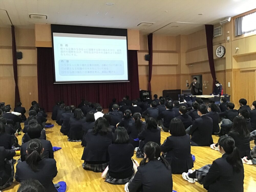 全体でのプレゼンテーションに加え、複数のグループに分かれ、2年生がSDGsの観点から学部や学問領域に関して調べ学んだことや、大手企業の取り組みの具体例の紹介などを行いました。