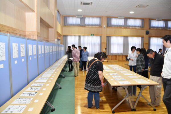 (写真は発表の様子と展示された色紙を見て回る保護者の方々)