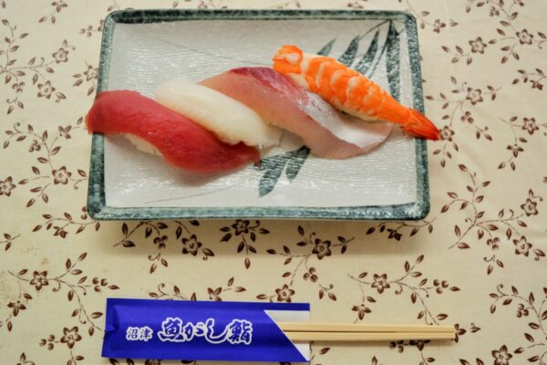 魚がし鮨グループ会長の沓間様の講話の後、鮨職人の先生の指導で実習が始まりました。32名(未来創造コース1年)の生徒たちは、シャリを丸めネタをのせ、悪戦苦闘はしましたが、何度かおこなううちに立派な鮨が握れるようになりました。