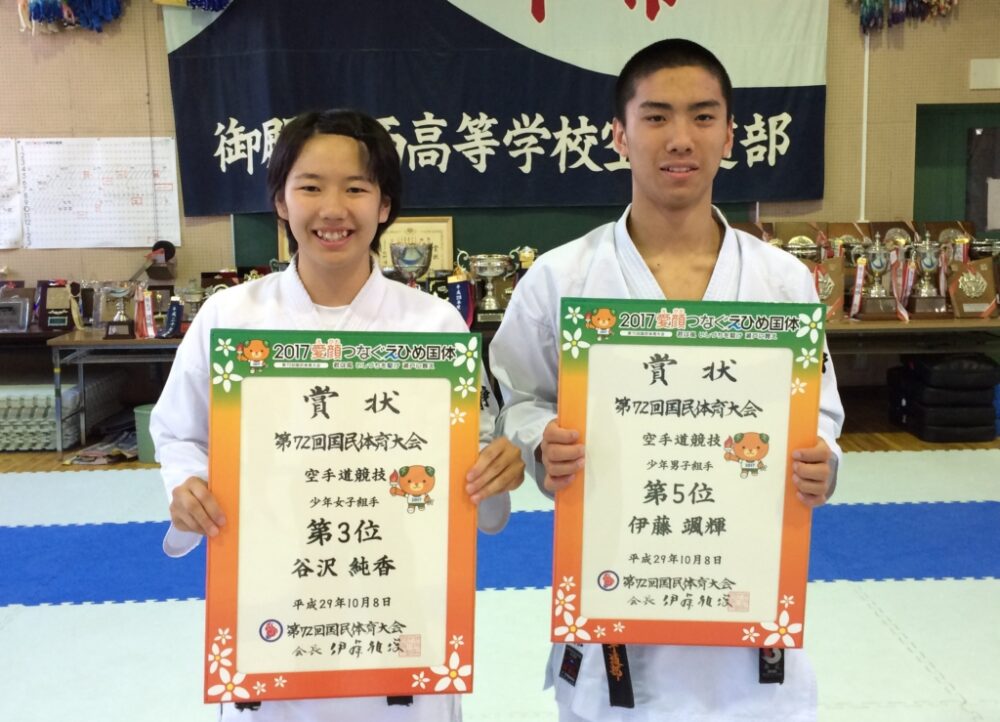 えひめ国体・空手道競技は10月7日~9日、愛媛県四国中央市で行われ、本校から出場した矢沢純香さん(3年生)が第3位、伊藤颯輝君(2年生)が第5位に入賞しました。