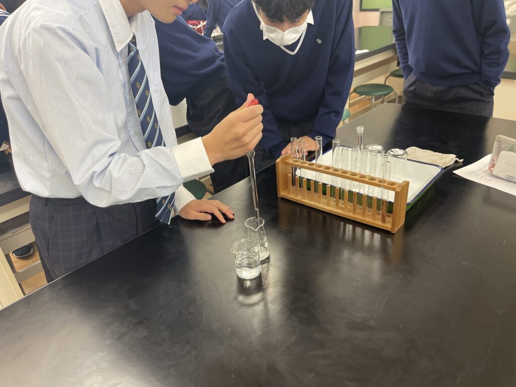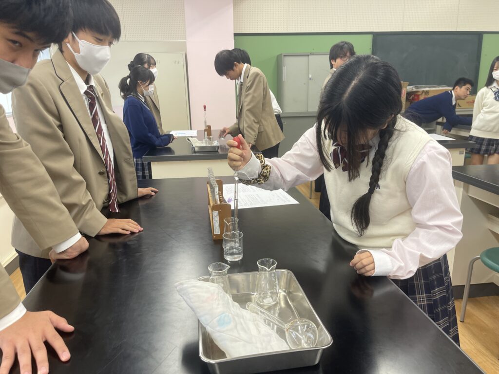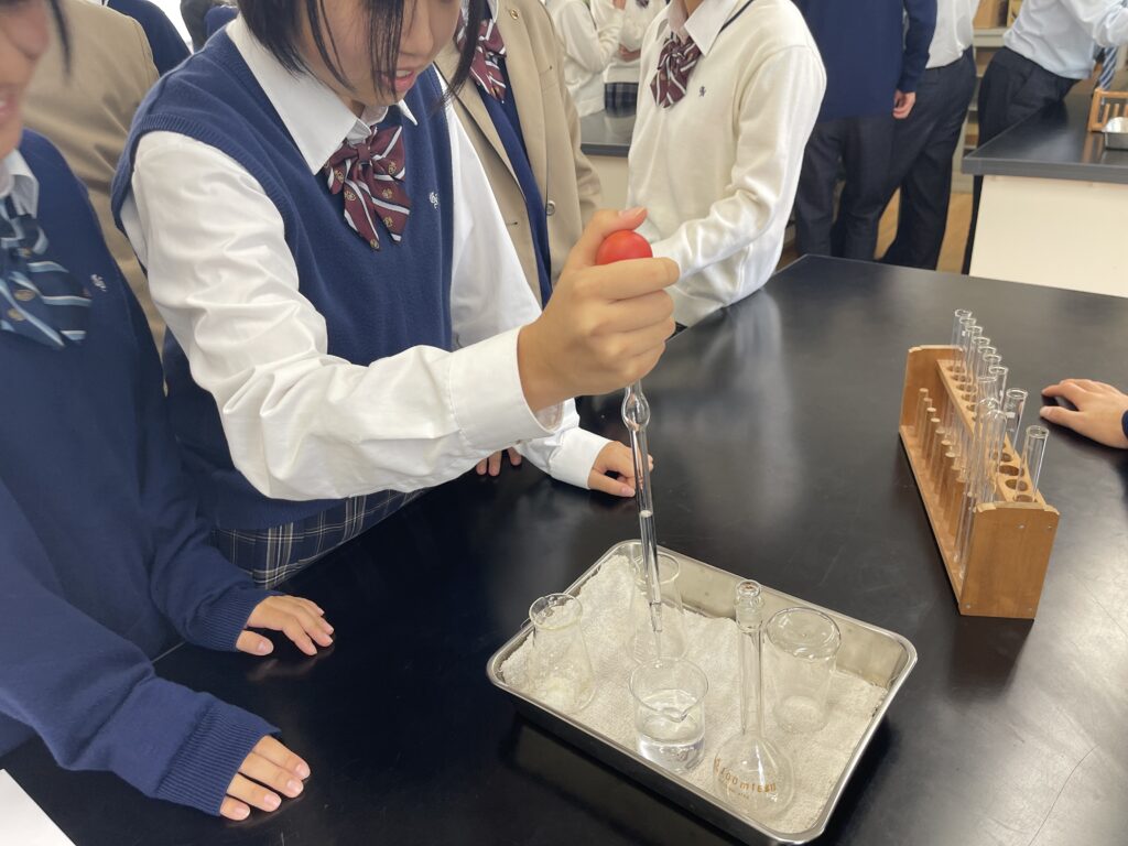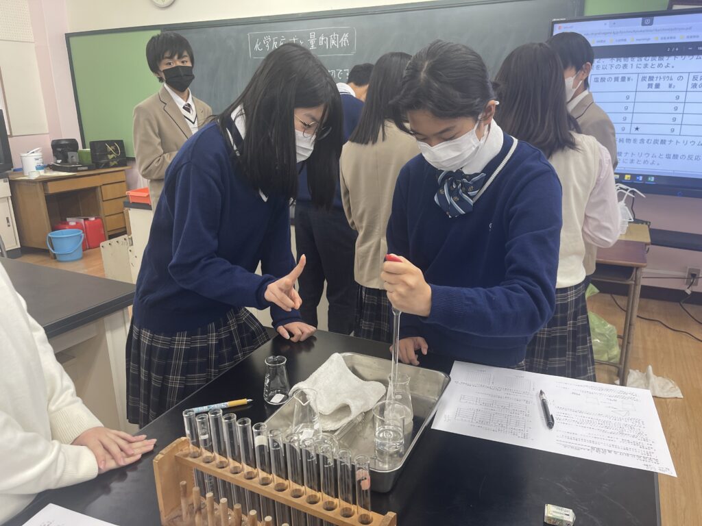 1年生の化学基礎にて現在、物質量の分野を扱っています。化学反応に関わる物質が、どのくらいの量で反応するのかを扱う分野です。今回は、炭酸ナトリウムに塩酸を加えて二酸化炭素を発生させる実験について、その量的関係を学びました。 ピペットや日頃触れることのない薬品への取り扱いなどについて、真剣に取り組む姿が見られました。