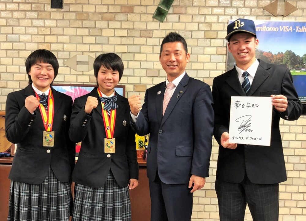 訪問したのは、プロ野球ドラフト会議にてオリックスから指名を受け先日仮契約を結んだ木須フェリペ君と、空手道世界大会にて金メダルを獲得した岡崎愛佳さん、銅メダルに輝いた島愛梨さんです。