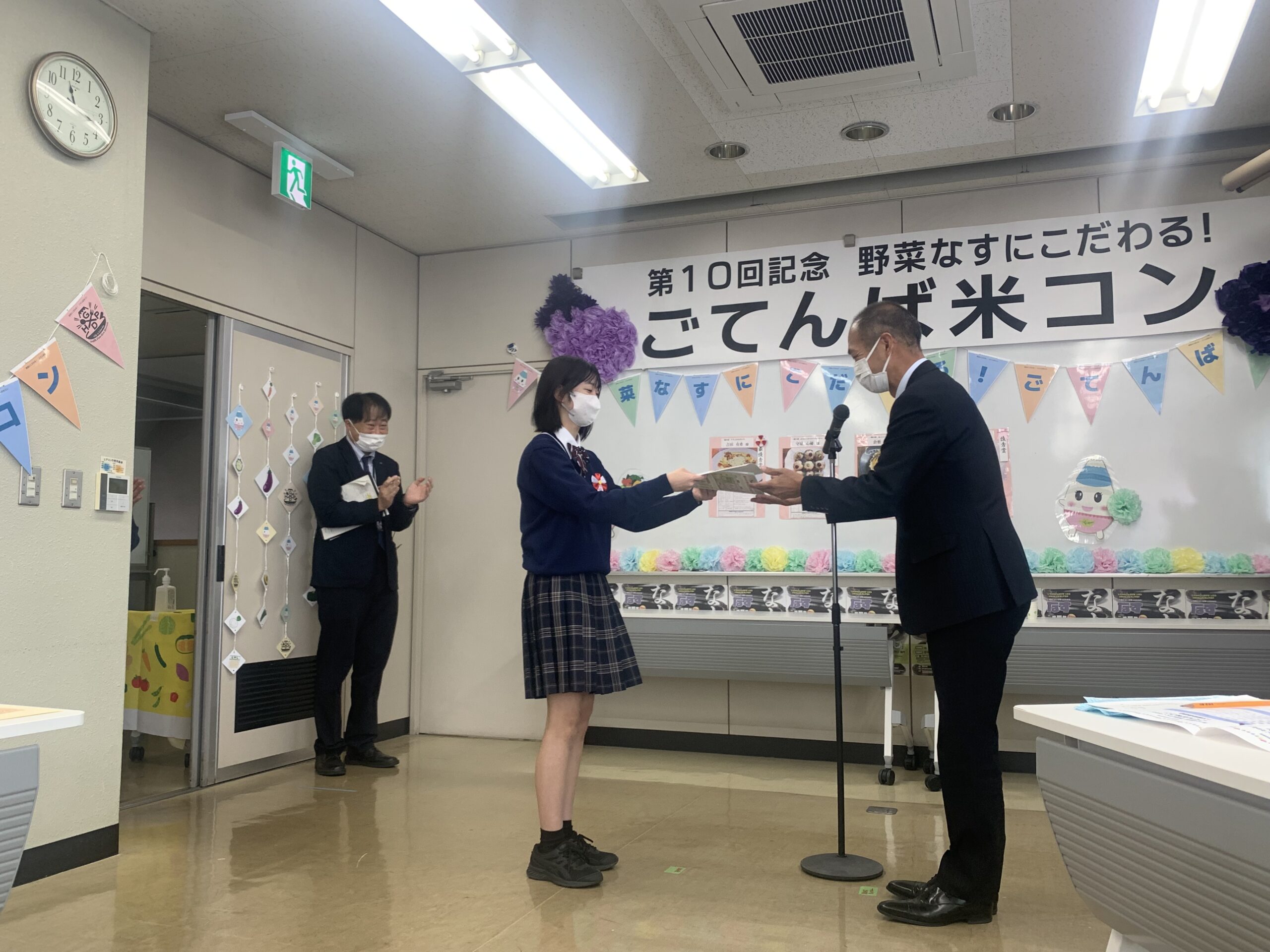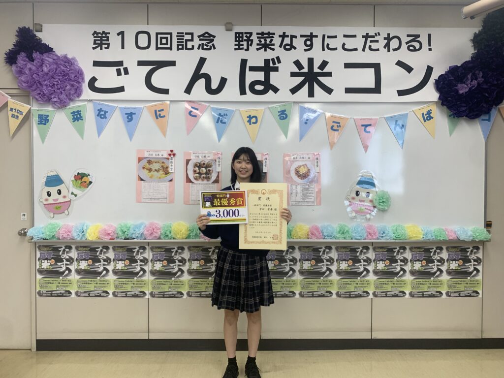 12/2(土)に第10回「野菜なすにこだわる!ごてんば米コン」が開催されました。 100件以上のエントリーの中から選ばれた4名で実技・実食審査を行い、吉田さん(1年)が最優秀賞に選ばれました! エントリーしたメニューは「ナス入りタコライス」です。 緊張していた吉田さんですが、練習の成果を発揮して素敵な料理を作ってくれました。 ダンス部にも所属している吉田さん、料理分野でも活躍の場を広げています!