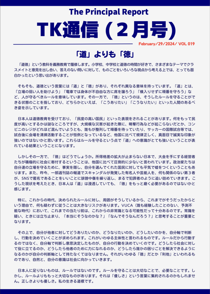 TK通信2月号を配信させていただきました。 明日は卒業式です。 3年生と保護者の皆さまにとって素敵な卒業式となることを心より祈っております。