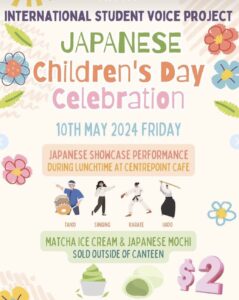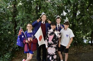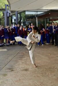 Kardinia International Collegeで「日本のこどもの日」をテーマにイベントが行われ、勝村さんは空手の形を、髙村さんは歌を2曲披露しました。昼休みに行われたこのイベントには大勢の生徒が見学に訪れました。そのような中で勝村さんと髙村さんは堂々と日本文化を紹介できました。