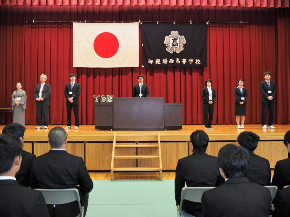 学校長式辞では、菊池校長が詩人宮澤章二氏の作品『行為の意味』の全文を紹介しながら、思いやりや助け合いの心を持ち、校章であるふじいばらの花が調和を保って咲くように、学年やコースの枠を越えて学校全体で協調しながら互いに切磋琢磨することを期待しますと生徒に向けて呼びかけました。