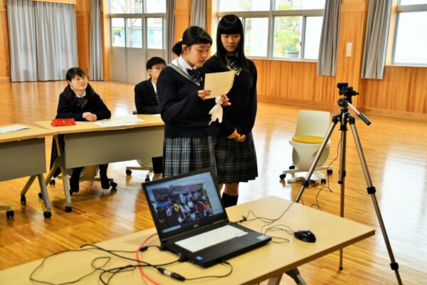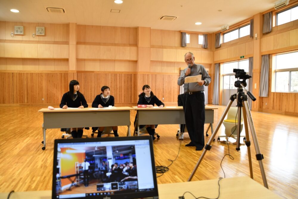 この日は、韓国プンサン高校で海外進学アドバイザーを務め、この交流プロジェクトの運営も担当されているティム・オルソンさんが来校し、ニューヨーク、韓国、フィリピン、沖縄の会場と御殿場西高校をインターネットで結んでの交流会が開かれました。各国の生徒たちは「祝福」をテーマに事前に用意した詩の披露と自国の文化を紹介し合う「カルチュラル・シェアリング」を行って、異文化理解を深めました。