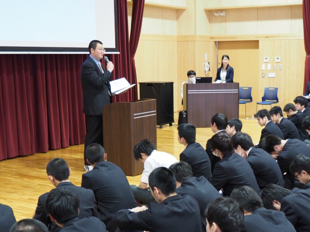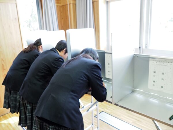 5月1日(火)、御殿場市選挙管理委員会の方々を講師に招き、3年生を対象にした主権者教育の出前講座が実施されました。今回は架空の選挙を想定した内容で、本校教員2名が立候補者となってポスターの掲示や広報誌の配布、選挙演説等を行いました。生徒たちは立候補者への投票や開票作業など、実際の選挙の流れを体験しました。