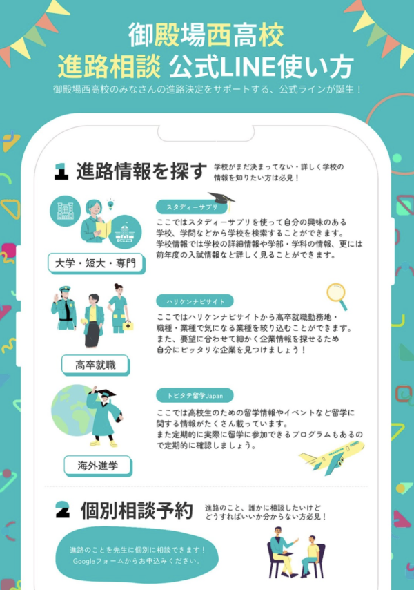 御殿場⻄⾼等学校は、2023 年 6 月に中高生向けキャリア探究サービス「はたらく部」等を運営する株式会社 RePlayce(代表取締役 CEO 山本 将裕。以下、RePlayce)と包括連携協定書を締結いたしました。2024 年 5 月、御殿場西高等学校の進路指導部の活動において、 LINE 活用を初めとするデジタル進路指導室の運営開始しました!