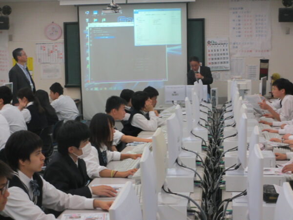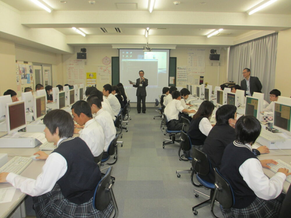 5月31日(木)本校パソコン室において、沼津情報・ビジネス専門学校コンピュータ科の先生方を講師に迎え、ITビジネスコースの2年生が「初心者でも安心、プログラミング入門」の講義を受けました。今回の講義では、プログラミング言語のひとつであるJavaScriptの概要について学び、実際にプログラミングすることで動くwebページの作成を行いました。生徒たちは技術を身に付けようと真剣に講義に臨み、密度の濃い連携授業となりました。