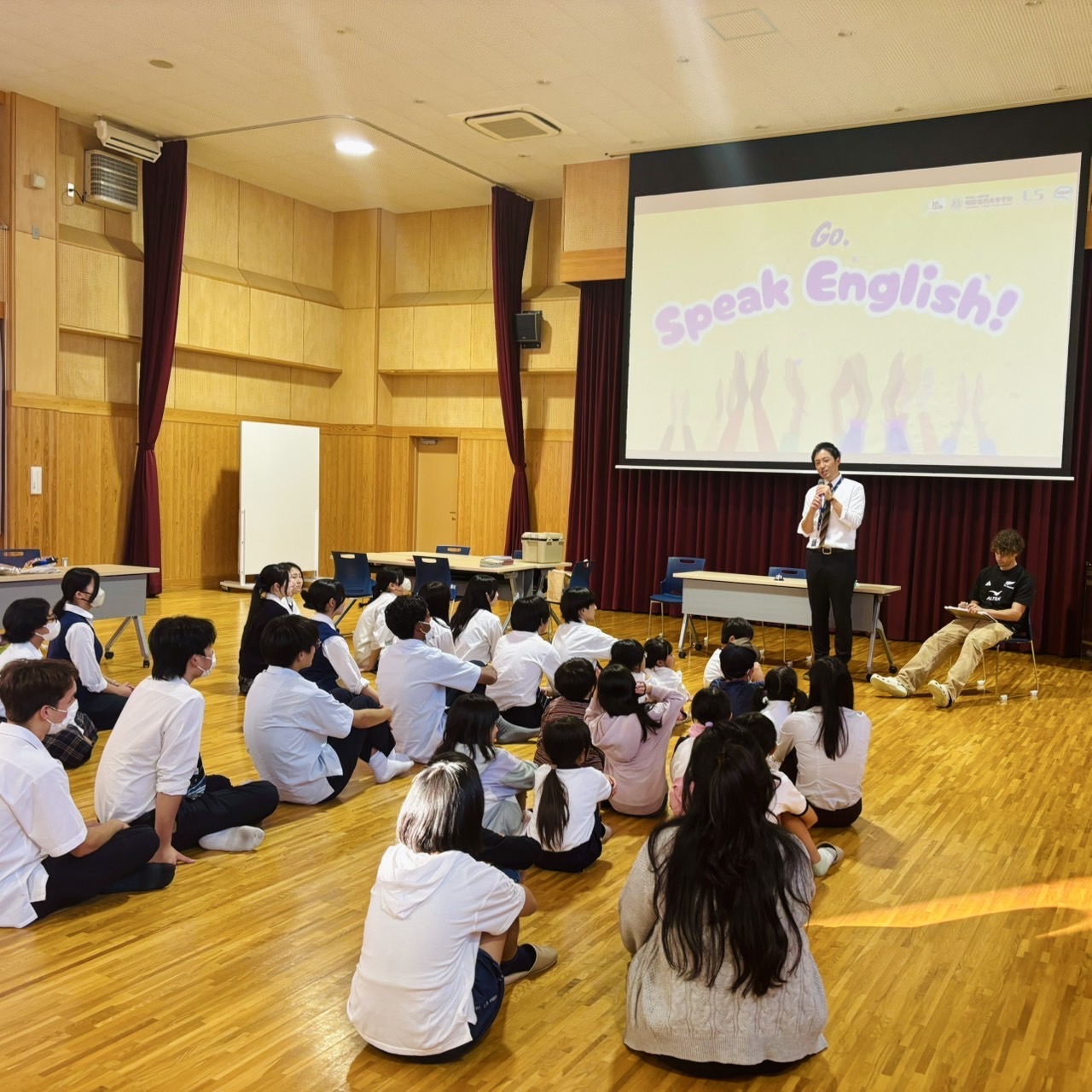 参加したのは、リトルスター英語教室に通う市内小学生15名と2名の先生、そして本校からは15人の生徒と、英語科の皆本先生、LISA先生をはじめとする先生たちです。