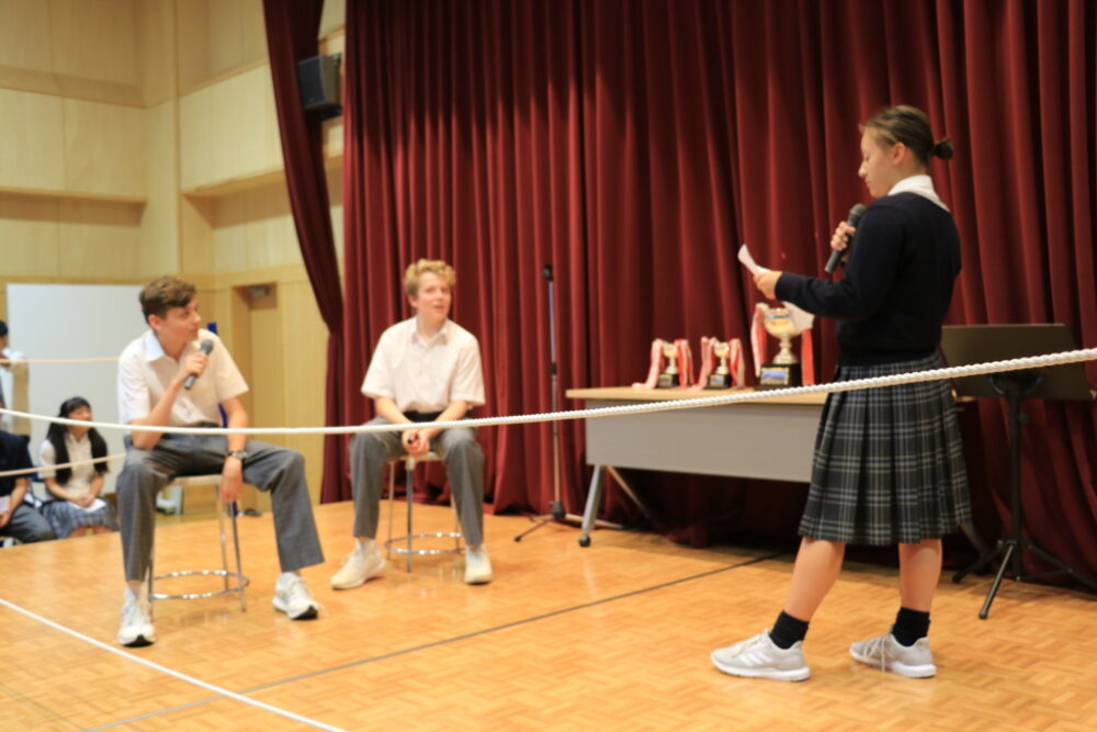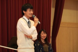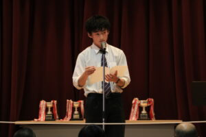 個人戦では、各コースから選ばれた18名の生徒によるトーナメント戦が行われました。例年同様、1回戦から選手1人ひとりの個性が溢れる朗読が繰り広げられ白熱した大会となるなか、巧みなトーク調の朗読で会場を沸かせた山﨑太陽さんが5回戦を勝ち抜き、第13代チャンピオンの座を獲得しました。会の最後には、昨年まで3年連続優勝を成し遂げた卒業生・木村沙弥香さんと山﨑太陽さんの即興詩対決1試合が行われ、新チャンピオンが絶対女王に挑みました。