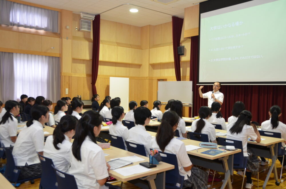 7月17日(火)、特進コース生徒全員を対象に、静岡県立大学食品栄養科学部栄養生命科学科教授、角替弘規先生の出張講義が行われました。テーマは「大学とはどのような場か」。大学は高校までの学校とどのように違い、進学先をどのように選べばよいかについて、角替先生の専門の教育学の観点から、経験談を織り交ぜて分かりやすくお話していただきました。大学卒業後の「就職」はゴールではなく、スタートの一つのかたちであること、人生において何を成したいかを考えることの大切さなどを話していただきました。