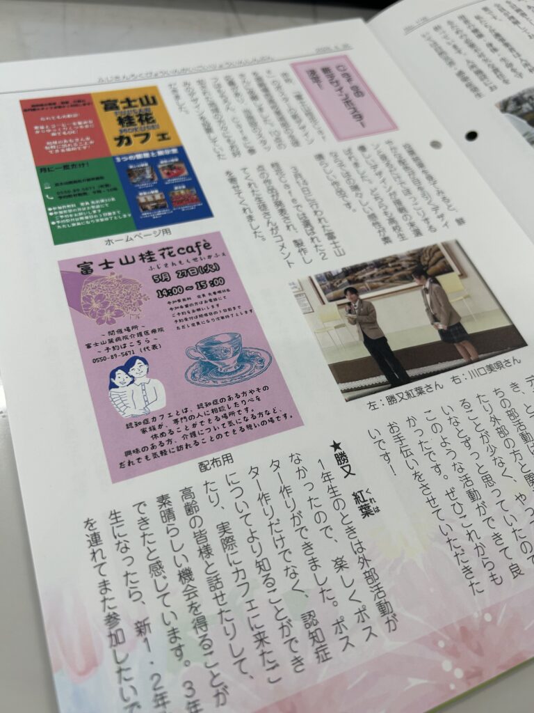 富士山麓病院介護医療院から依頼を受けて、病院が定期的に開催しているカフェのポスターを作成しました。医療院の皆さんからも投票してもらい、現在2点のポスターが使われています。ポスターとお披露目の様子が介護医療院内の新聞に掲載されました!