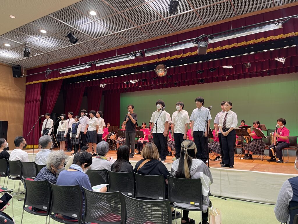 2年生の探究ゼミ(音楽基礎)による校歌斉唱でスタートし、吹奏楽部による演奏になりました。吹奏楽部は人数も増え、演奏に厚みが増し、これまで以上に素晴らしい演奏でした。