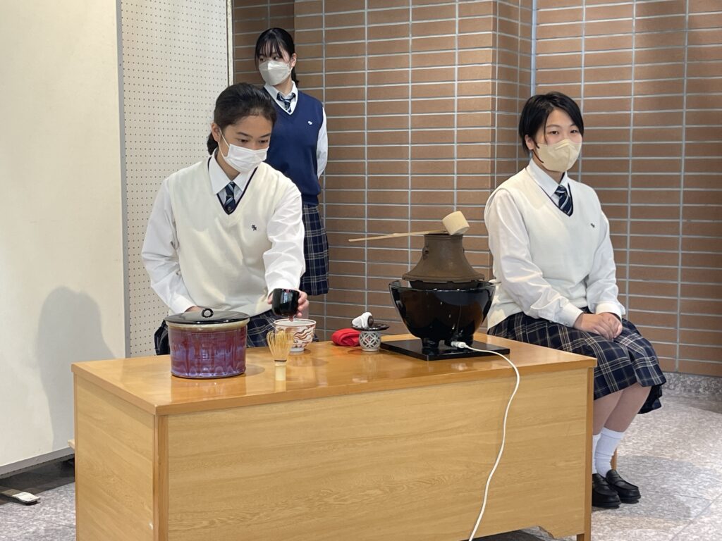 ステージ発表が終わると、別会場のお茶会の場に行くと、吹奏楽部の皆さんにお手前を披露する茶道部の姿。美味しいお茶を生徒も先生方も堪能していました。
