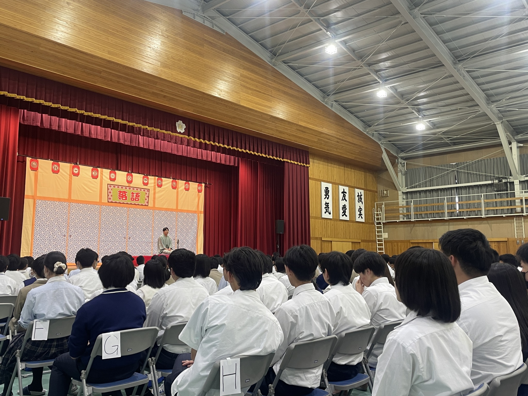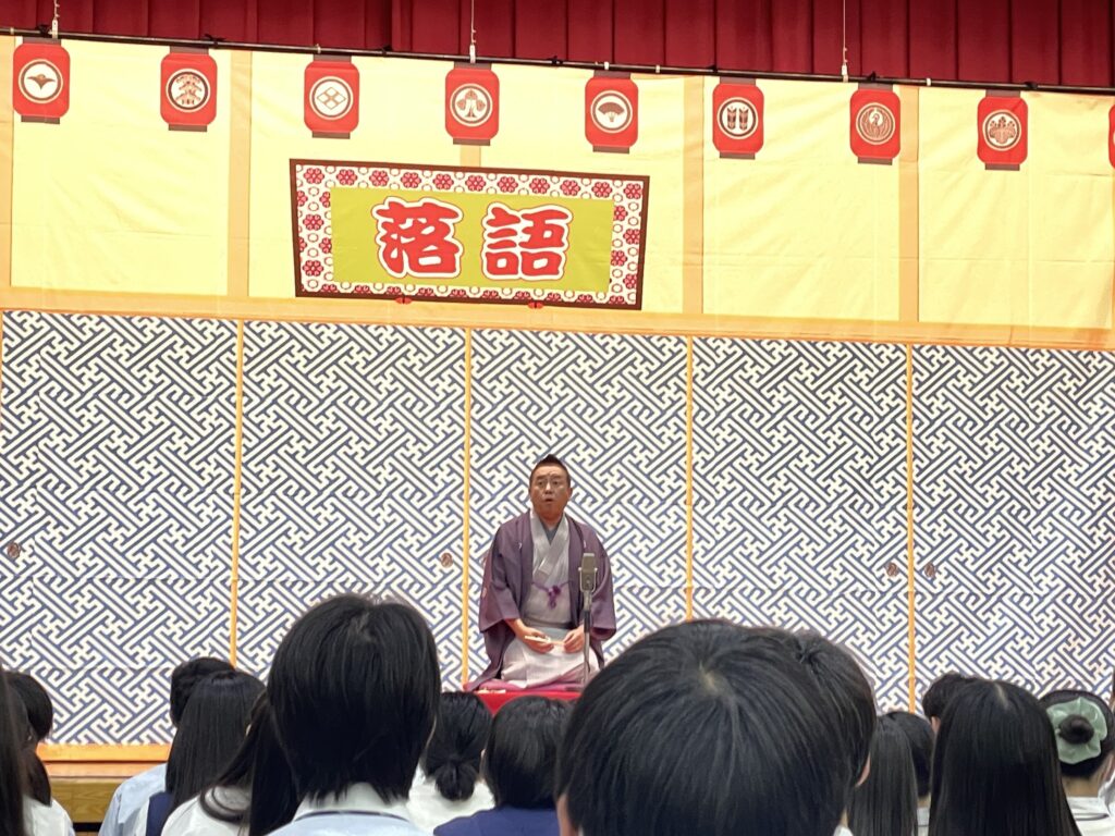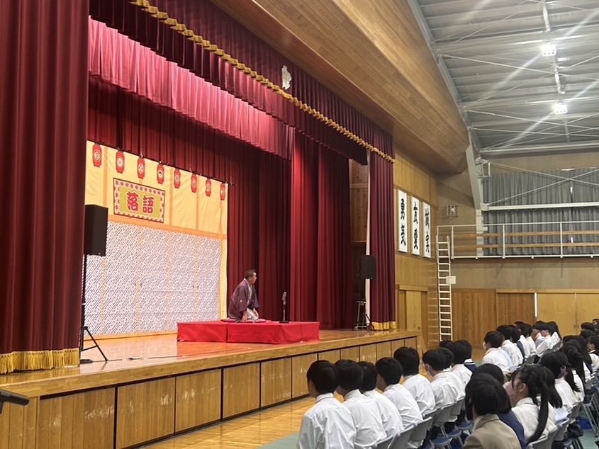 日本における伝統芸能である落語がどのようなものであるのかを生徒も先生方も興味津々で、落語を楽しむための見方、うどんやそばのすすりといった落語のお馴染みの技、短い落語のお話の紹介などをしていただきました。