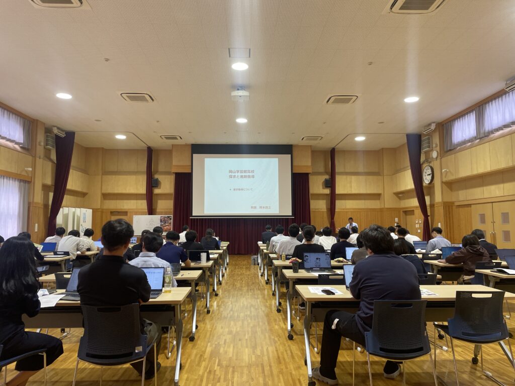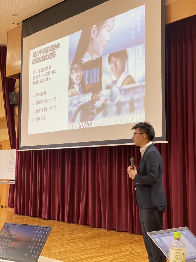 今回の研修は、岡山学芸館高校から小笠原副校長と岡本教頭にお越しいただき、探究学習と進路指導についてご講演いただきました。