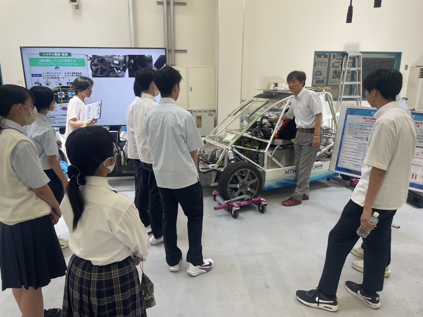 その後、工学部自動車工学棟を訪問したり、大学施設見学をさせていただきました。ドライビングシュミレーターを用いた運転しやすい車両の研究を行っている研究室に訪問させていただきました。情報選抜が習っている授業が基礎として多く活かされており、身近な研究に目を輝かせていました!