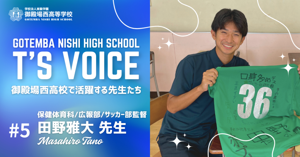御殿場西高校で活躍する先生を紹介する『T’S VOICE』の第5弾は、4年目体育科でサッカー部監督の田野雅大先生です。担任、広報部、サッカー部監督というマルチに活躍しており、生徒からの信頼も厚い田野先生。学級運営等にも工夫をしており、いろんなことに試しつつ、常に生徒の自立へと繋げることを意識しています。そんな熱い田野先生は何を語ってくれたんでしょうか??