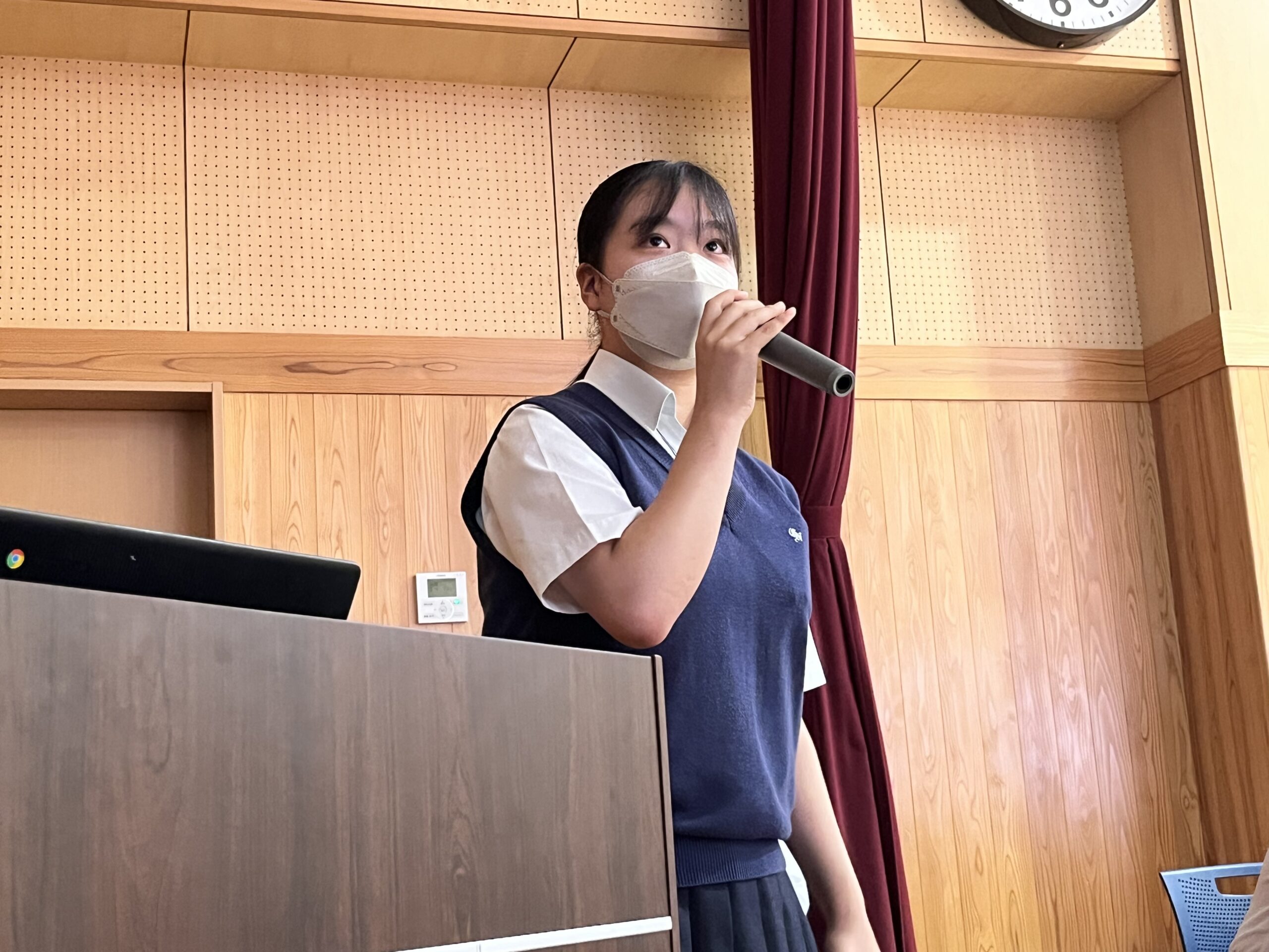 8月26日(火)3年生の水野さんと遠藤さんが、先日参加した防災研修を踏まえ、職員会議にて防災意識の向上と避難訓練の改善に向けたプレゼンテーションを本校教職員に行いました。