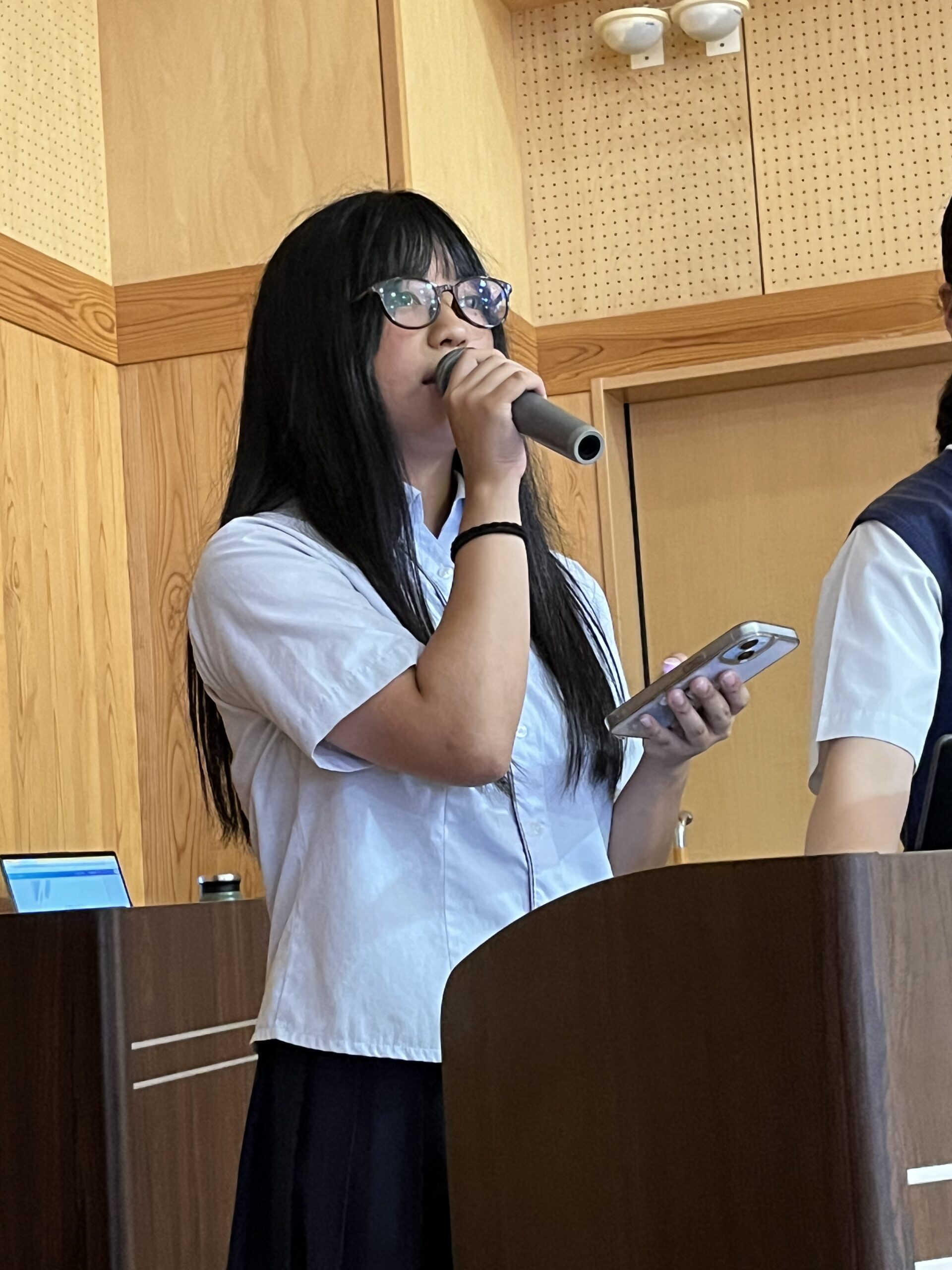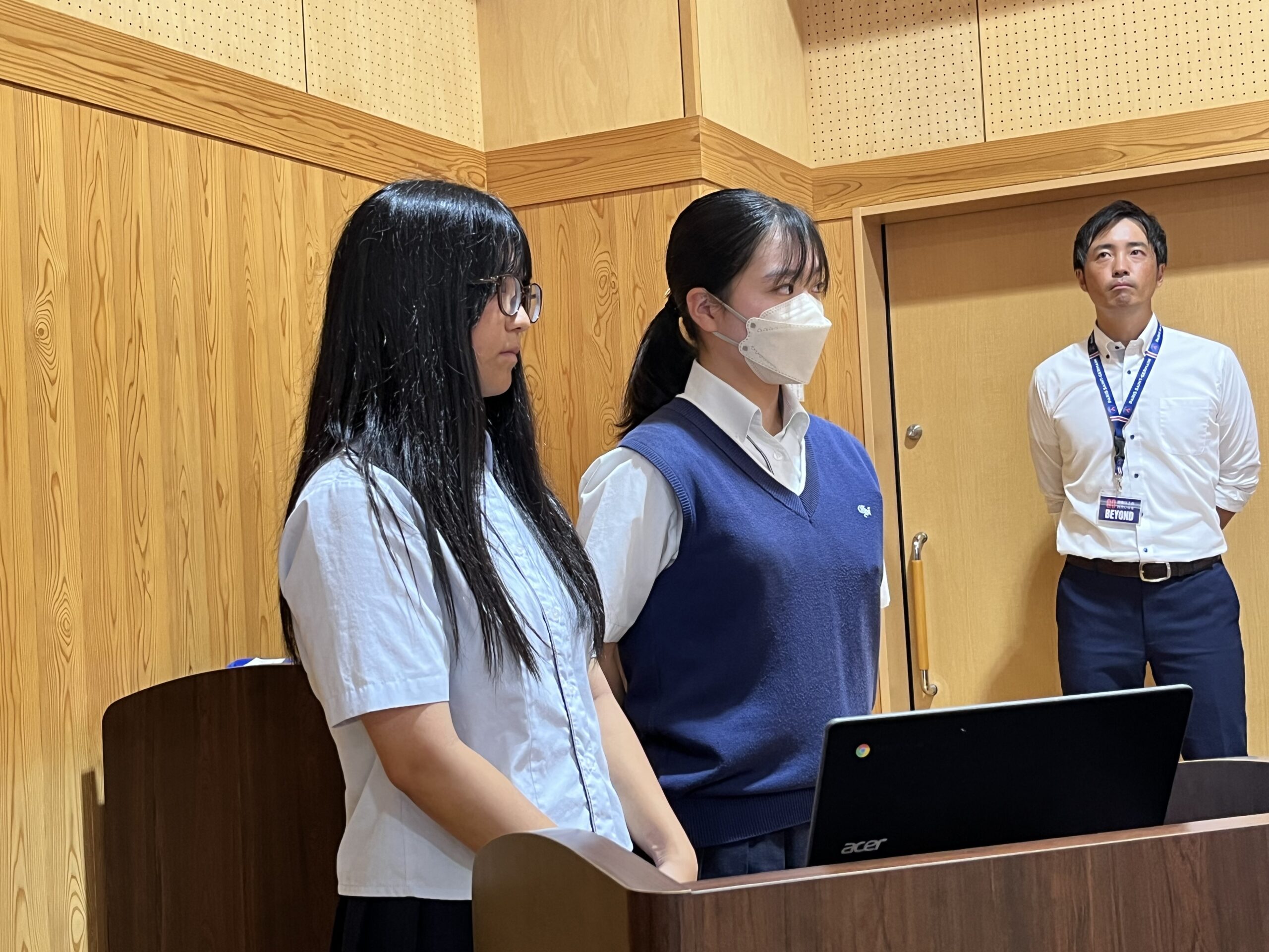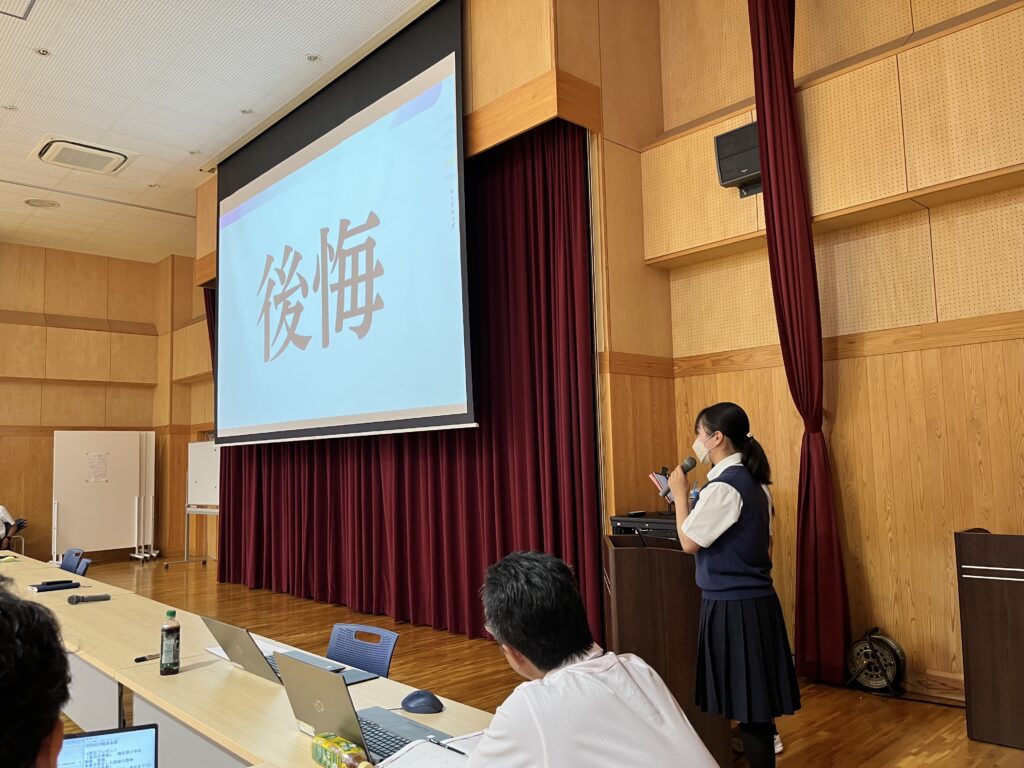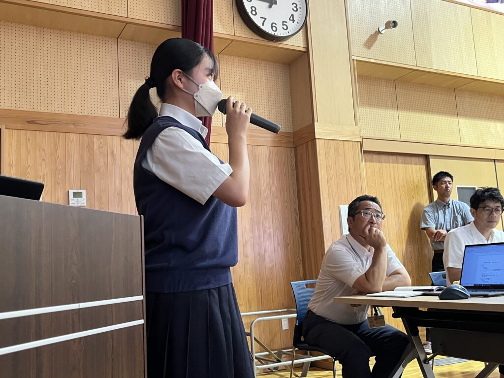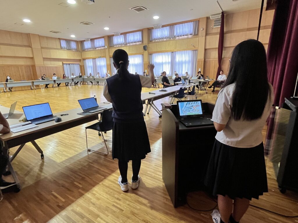 夏休み中、水野さんと遠藤さんは、今回学んだことを御殿場西高校の防災意識の向上と避難訓練の改善に繋げるために、校長室にて直談判を行い、職員会議でのプレゼンの機会に繋がりました。