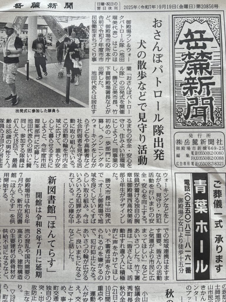 9月19日(金)の岳麓新聞におさんぽパトロール隊の活動について掲載されました。