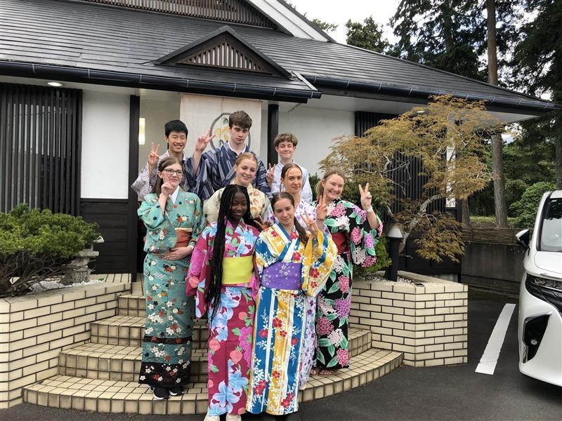 9月30日から10月7日までのJapan Study Tourは本当にあっという間でした。最終日は着物体験を行いました。御殿場市内の着物店「やましろ」さんのご厚意で、生徒一人ひとりが着物や浴衣を着用させてもらえました。日本の伝統的な柄や、鮮やかな花柄のものなど、みんなで着物を着るととても華やかでした。また、お店の近くの竹林あたりの散策も行いました。日本の自然を感じられる空間でした。