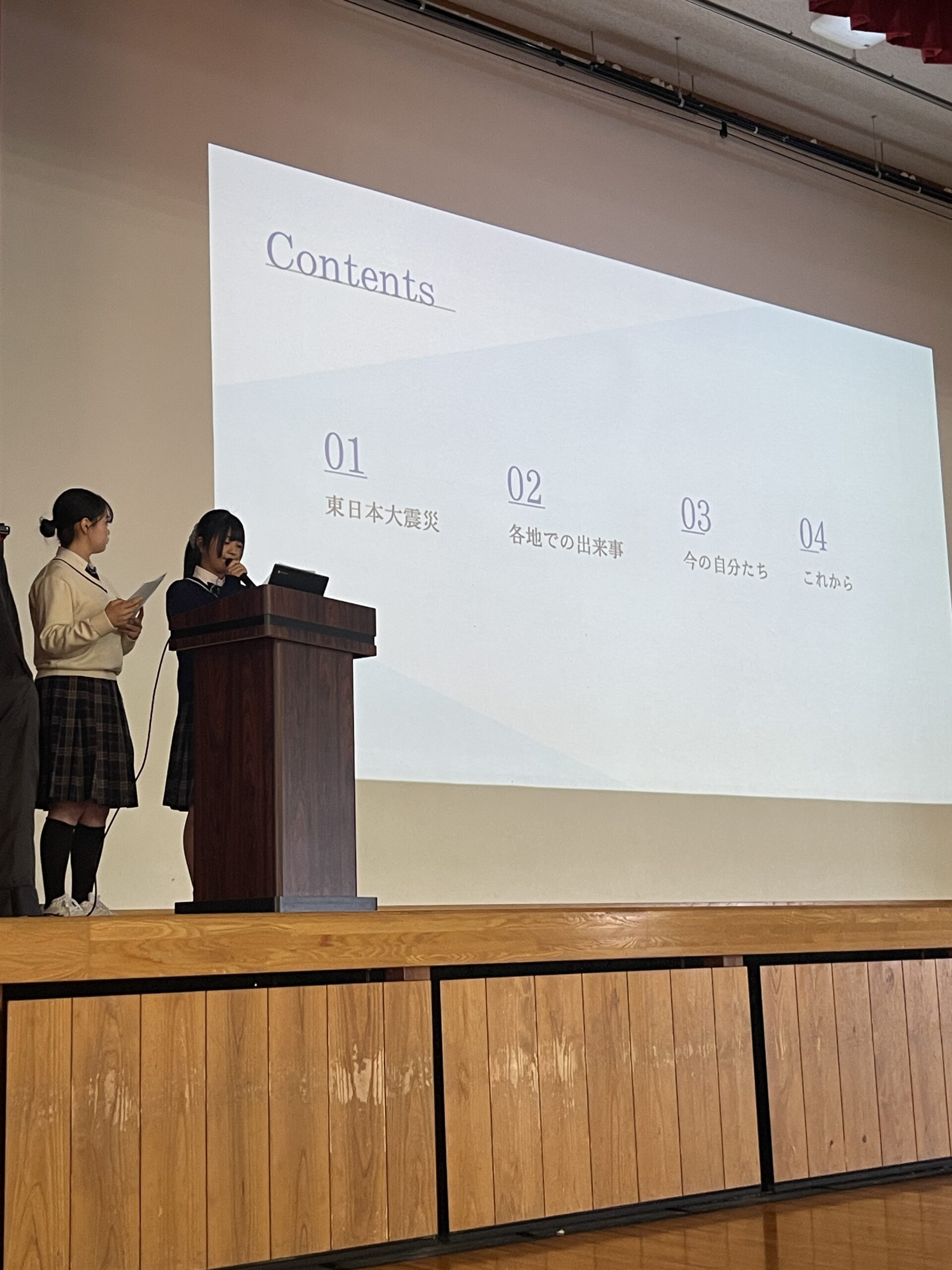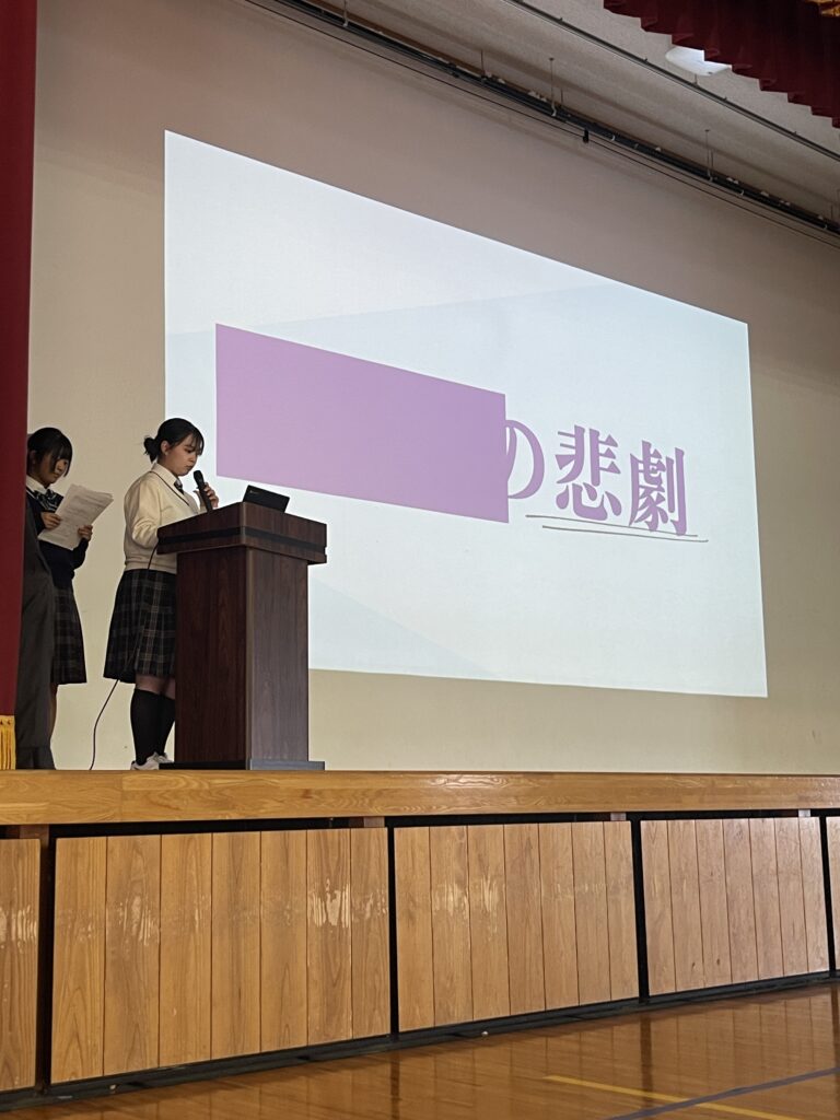 10月17日(金)壮行会終了後、3年生の水野さんと遠藤さんから、全校生徒に向けて防災に関するプレゼンテーションを行いました。