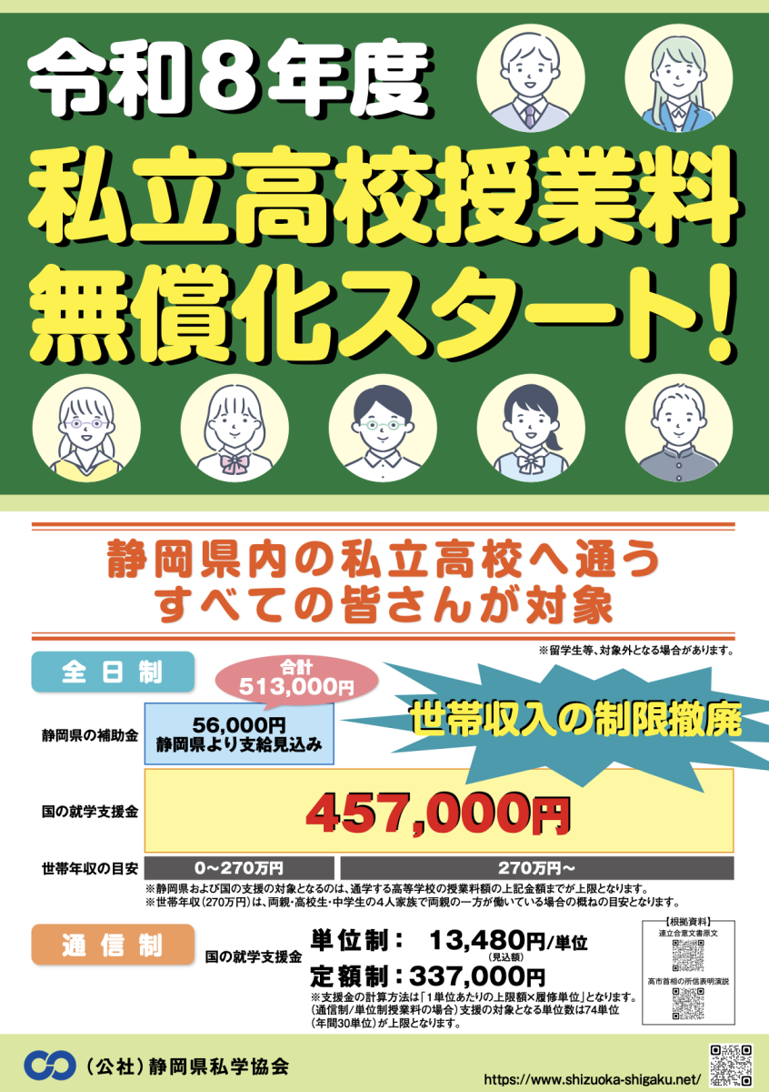 2025年度から静岡県を含む全国の私立高校では、世帯年収の所得制限がなくなり、年間118,800円の就学支援金が支給されます。これにより、授業料が118,800円以下の私立高校は実質無償化となります。2026年度にはさらに支援額が年間457,000円に増額される予定です。
