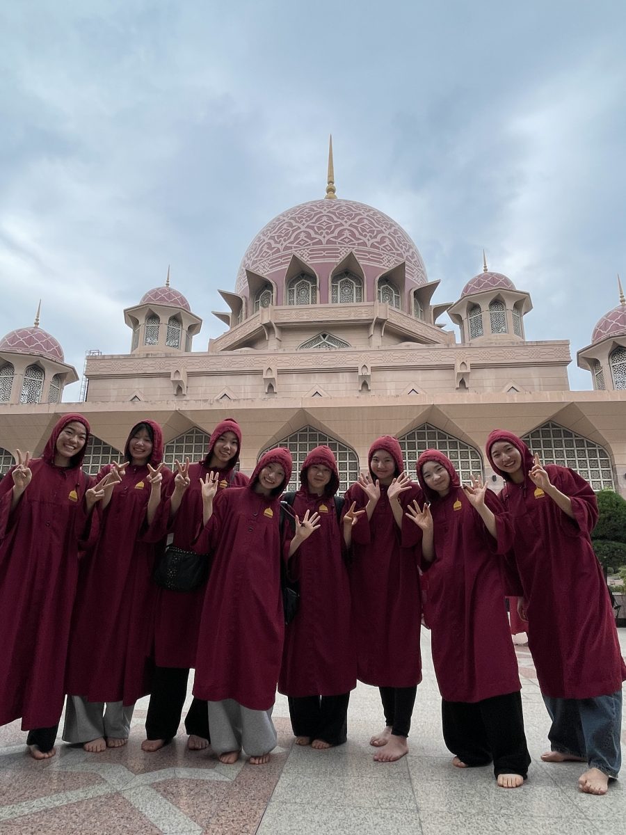 マレーシアコースは18日(日)に本校を出発し、無事に到着後、早速農村での「ホームビジット」体験を行いました。現地の方々との交流を通し、マレーシアの家庭の雰囲気を知ることができました。午後は「ピンクモスク」の呼称で有名なプトラモスクを訪問し、イスラム教の文化を守り人生初のヒジャブを着る女子の姿が見られました。