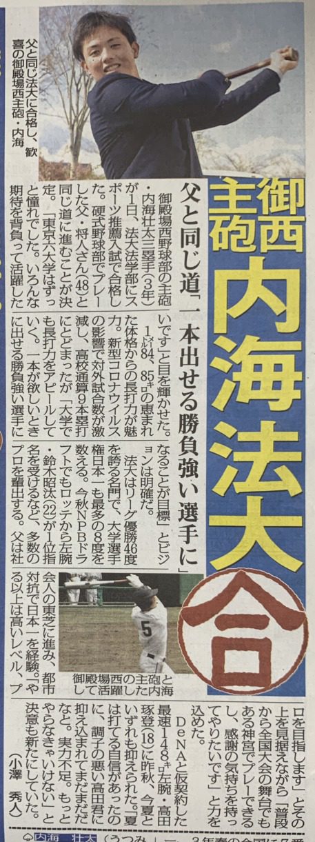 本校野球部3年の内海君が法政大学に、磯部君(元主将)が国士舘大学に合格し、12月1日(火), 7日(月)のスポニチに掲載されました。このように大きく扱っていただき、ありがとうございます。 御殿場西高校の野球部の創成期を支えてきた磯部君と内海君、法政大学と国士舘大学という東京六大学野球と東都大学野球という最高の舞台で、それぞれチームの中心となるような選手になってもらいたいです。