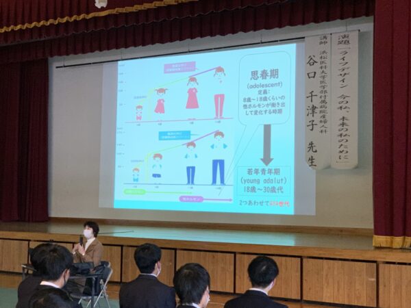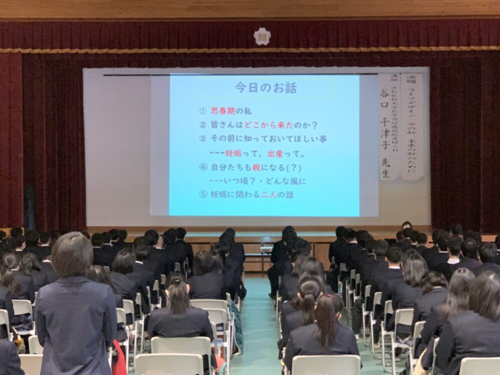 ライフデザイン講座とは、生徒たちが将来結婚、出産、子育ての希望をかなえるライフデザインを描けるよう、卒業を控えた3年生に対して正しい知識や情報を提供し、妊娠・出産に関して学ぶというものです。近年の出産の晩婚化は、少子化の原因の一つとして指摘されるとともに、高年齢での出産が多くなることに比例して、妊娠・出産に対するリスクが増加しているという社会的な背景を踏まえて、今回のライフデザインの実施となりました。