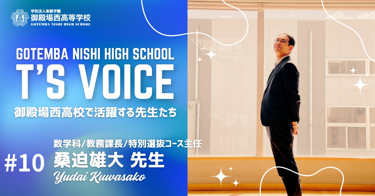 御殿場西高校の個性豊かな先生たちを紹介する「T’S VOICE」は今回で10回目の投稿となります。記念すべき今回は数学科・教務課長・特別選抜コース主任の桑迫雄大先生が登場!14年目を迎える桑迫先生ですが、さまざまな分野でマルチに活躍してくれています。実はお茶目で子煩悩な一面を持つ桑迫先生の本音を探ってみました。