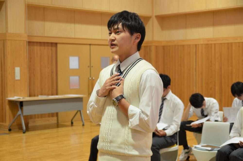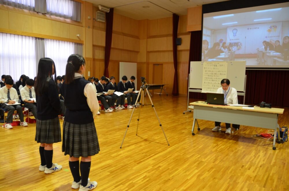詩に関する質問や感想を述べあう場面では、キャロライン・ケネディ前駐日大使からの「新元号を迎えて、どのように感じていますか?」と質問があり、生徒は平和への願いを英語で答えました。