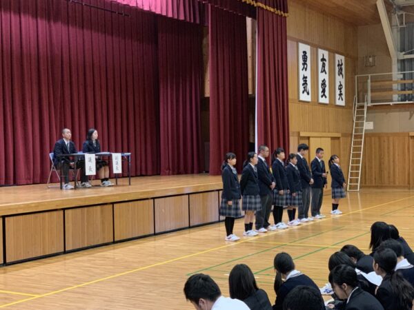 11月21日(木)に本校体育館にて後期生徒会辞令交付と生徒総会が行われました。後期の生徒会長は井上柚子葉(2年)、副会長は藤田悠弥(2年)、加藤大嗣(2年)です。御殿場西高校は大きな変化の波を迎えていますが、生徒会の皆さんで良い雰囲気の学校を作っていきましょう。生徒が主体的に行動し、クラスや学校全体をよくするためには何ができるのか、何をすべきなのかを一人一人が考える学校をみんなで目指しましょう!