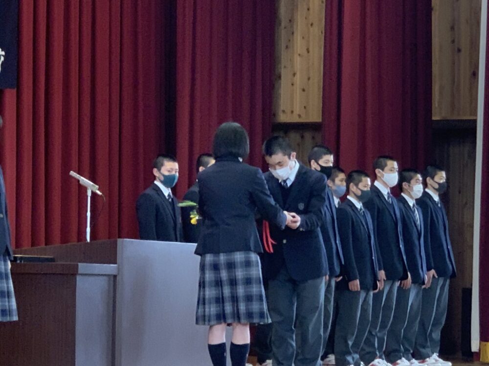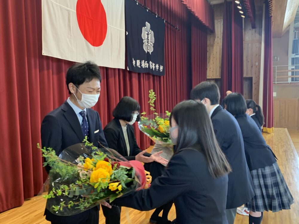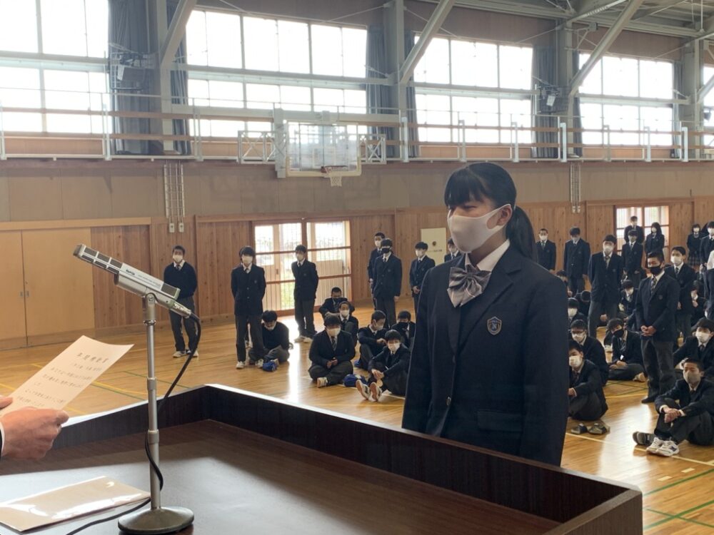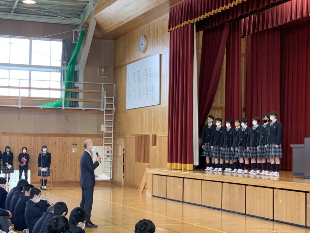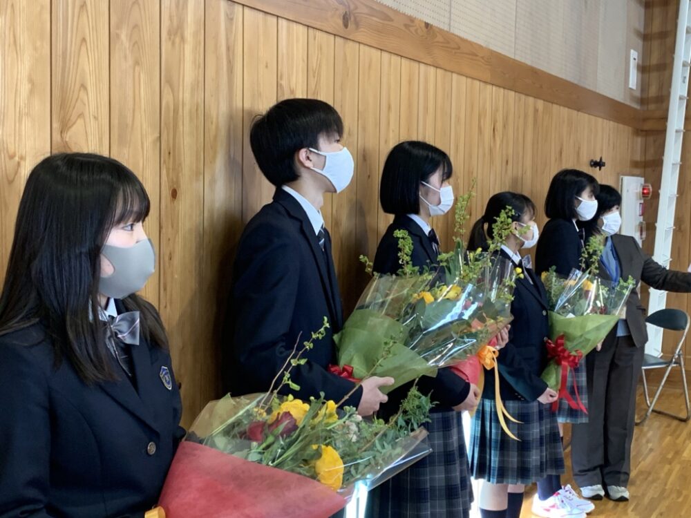 そして、今年度をもって本校を退職される教職員の先生方が紹介されました。浦田先生(英語)、杉浦先生(国語)、高野先生(理科)、勝亦先生(事務)、長い間本校を支えていただき、本当にありがとうございました。先生方が生徒たちの心に宿したもの、本校に残してくれたものは、これからも大切にしていきたいと思います。
