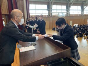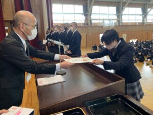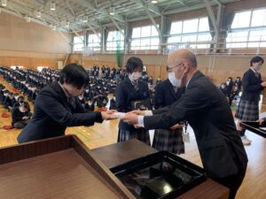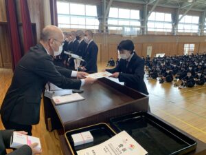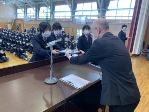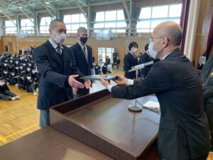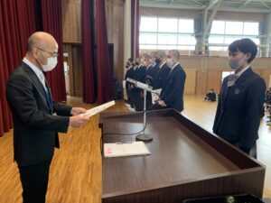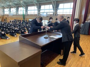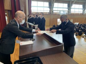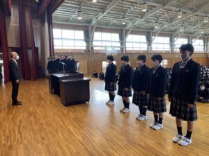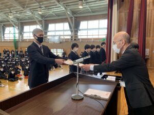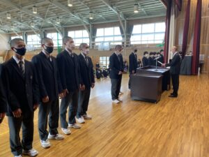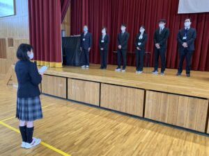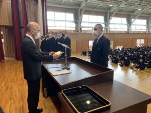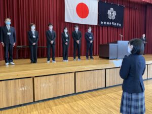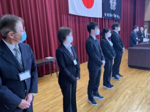 式に先立ち、先日行われた全国空手道選抜大会で好成績を残した空手道部の表彰が行われました。久しぶりに全体の前での表彰ということで緊張した面持ちの空手道部の皆さんでした。