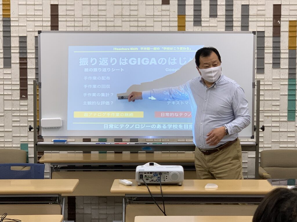 さて、こういった大きな変化に対応していくために、本校のICT教育にとって心強いアドバイザーに平井総一郎先生をお迎えしました。平井先生は茨城県の公立小中学校教諭、校長、教育委員会指導主事等を歴任した後、2017年より情報通信総合研究所特別研究員に就任されました。文部科学省の「ICTを活用した教育推進自治体応援事業」ICT活用教育アドバイザー及び企画評価委員、総務省プログラミング教育事業推進会議委員などを歴任するなどICT教育の先頭を走ってきました。昨年度末の3月に行われた本校のICT教育研修にオンラインで登壇していただき、「つべこべ言わずやってみろ!」と熱い言葉で激励していただきました。