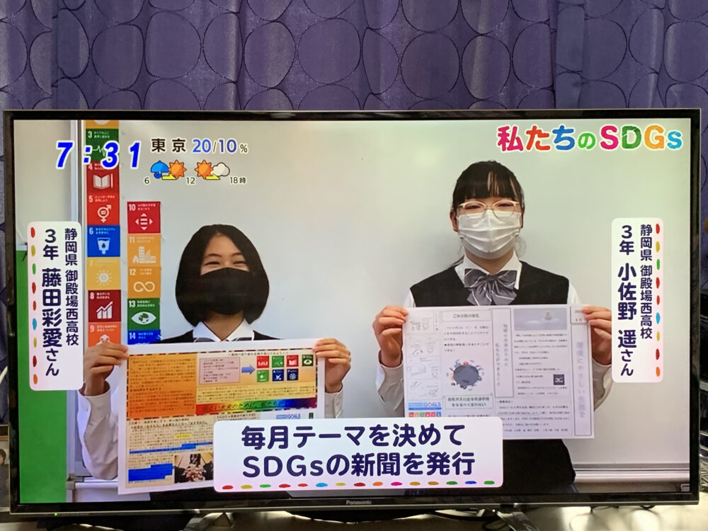 7月16日(金)『あさチャン!』(TBS)の「私のSDGs」というコーナーに、本校のSDGsの取り組みが登場しました。これは全国の学校が、それぞれの取り組みを紹介していくというもので、時間は15秒間。短い時間での紹介でしたが、本校のSDGs新聞について小佐野さん、藤田さん(ともに3年)が紹介してくれました。
