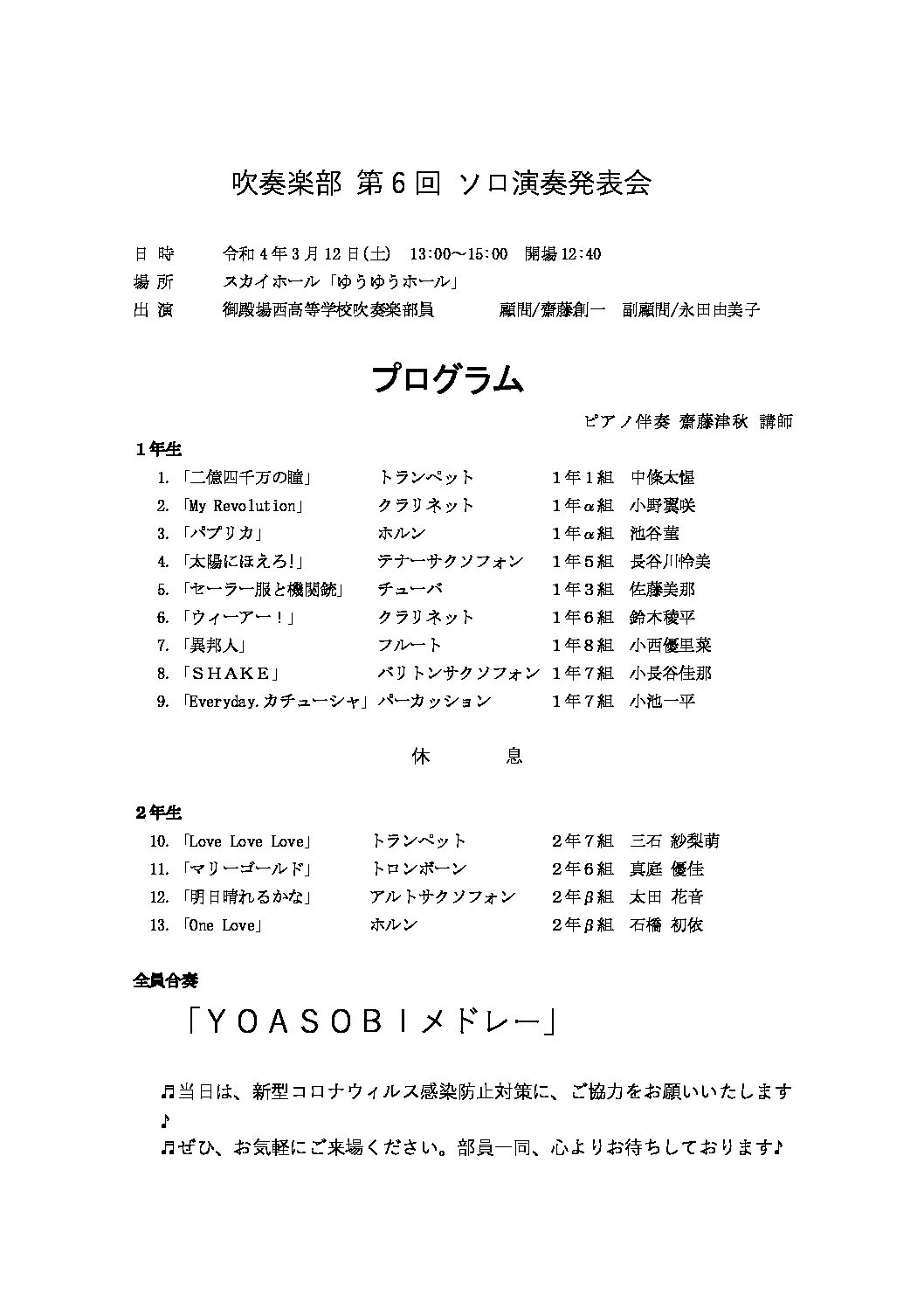 吹奏楽部では、「第6回・ソロ演奏発表会」を開催します。コロナ対策のため、来場者を、保護者・今年度卒業生・先生方に限定して行います。