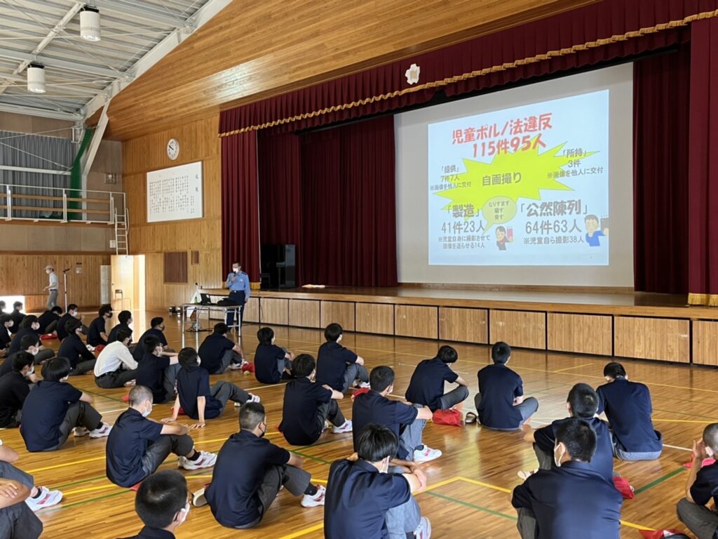 7月14日(木)1年生を対象に御殿場警察署 生活安全課 仲澤様に来校していただき、ネットモラル教育を行いました。 色々お話をしていただいた後でDVDを視聴し、SNSで画像や動画が拡散すると自分自身の将来や家族にまで被害が及ぶ怖さについて再確認することができました。 自分だけは大丈夫という気持ちから、他人ごとではないと自分に置き換えて考えるようになったと思います。 今日の講演が今後の生徒の生活に活きることを願っています。全国の被害者も減りますように。