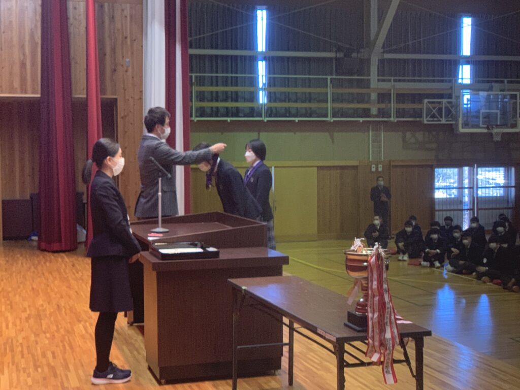 表彰では空手道部、陸上部、ホッケー部や英検、漢検取得者などが表彰されました。