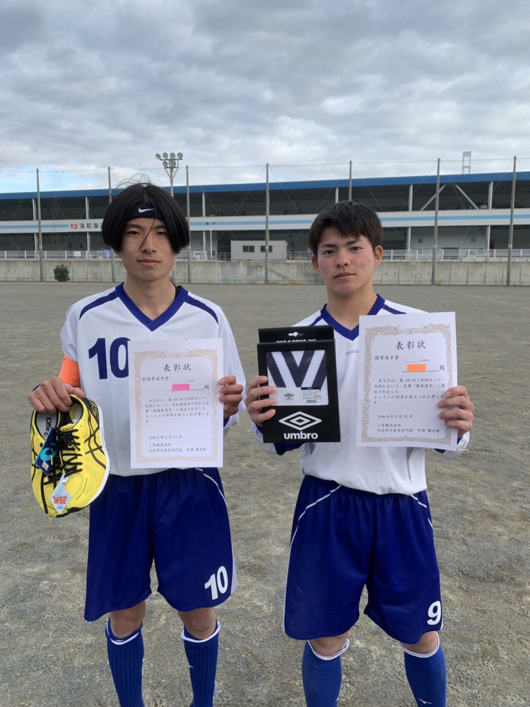 2月11日(土)に静岡市の興津多目的グランドで三幸杯が 行われました。 今回は東京の学習院高等科を招待し、県内3チーム計4チームで トーナメントを行いました。 結果は、初戦沼津東高校に5-0で勝ち、決勝は清水国際高校に 1-0で勝ち、優勝することができました。 なお、今大会で最優秀選手に2-8伊倉陸夢、 優秀選手に2-1岩田思音が選ばれました。 また県総体に向けて強化していきたいと思います。