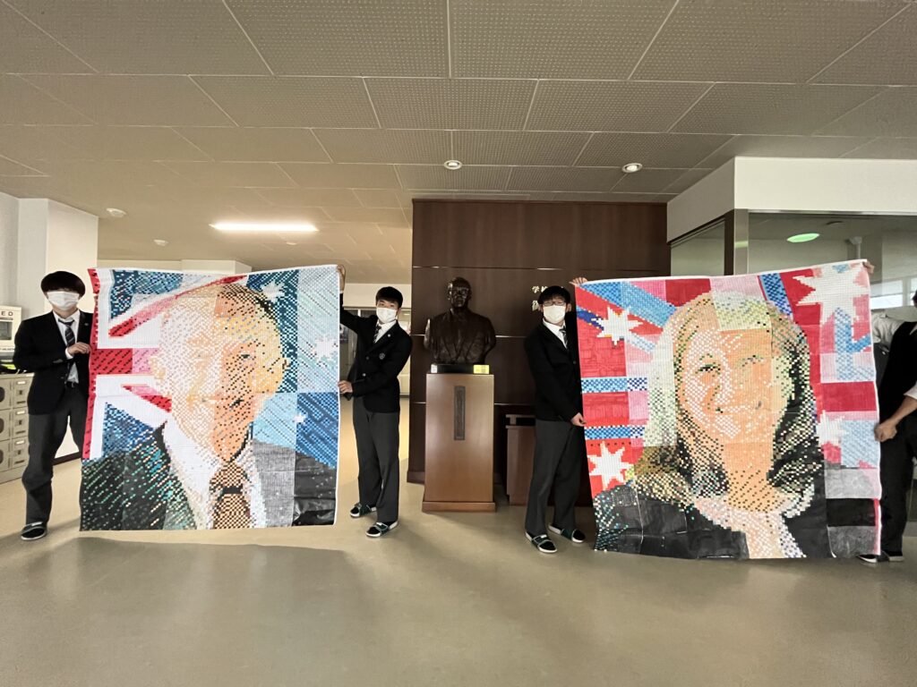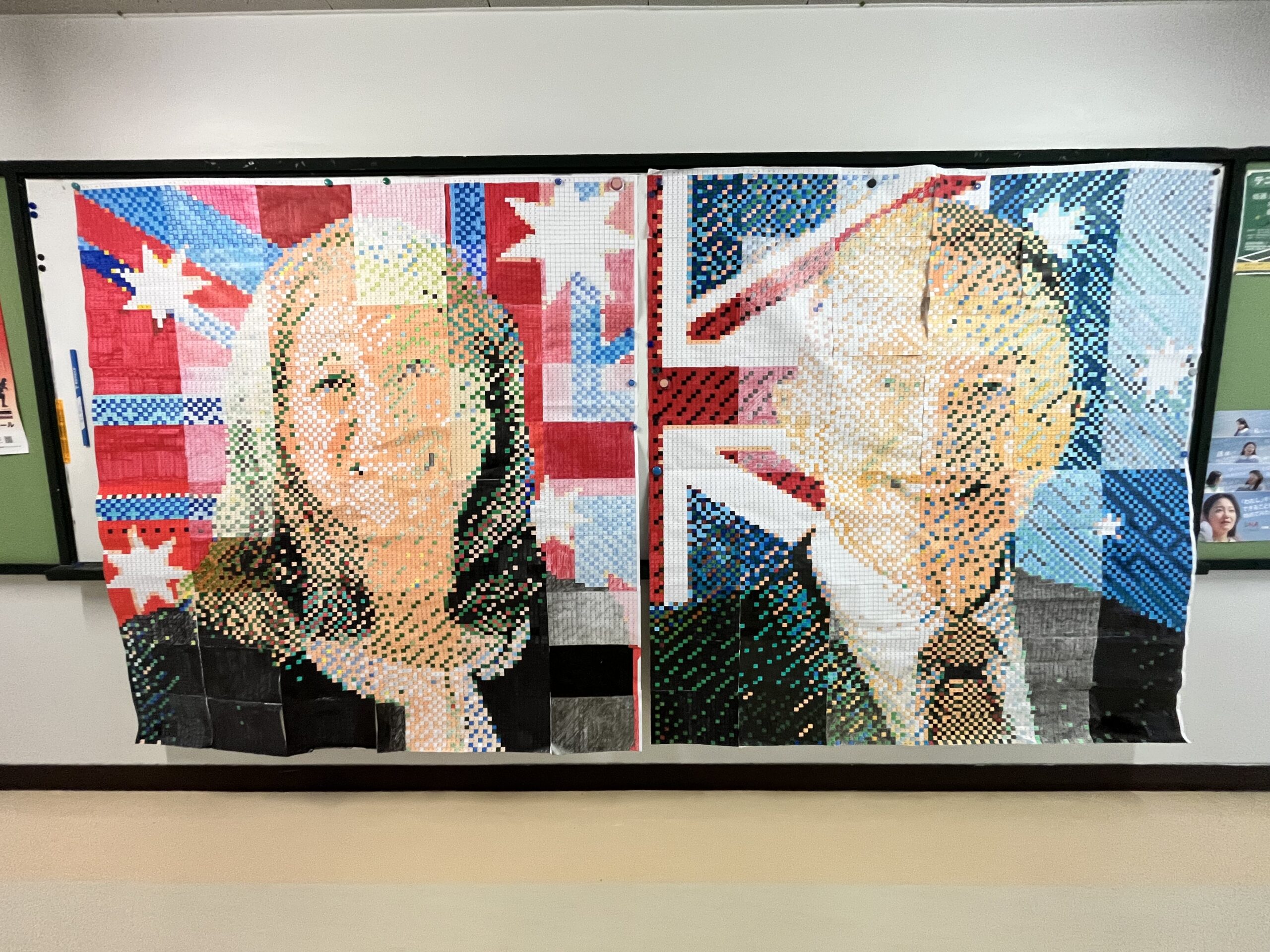 本日はKardinia International Collegeの28回目の創立記念日です。 本校も全校体制でお祝いの気持ちを込め、Kardiniaのキャサリン・ブロックハート校長先生、中等部長ジェフ・ウラード先生の巨大モザイクアートを製作しました!これからも両校の絆を大切に、たくさん交流しましょう! 本日はおめでとうございます。
