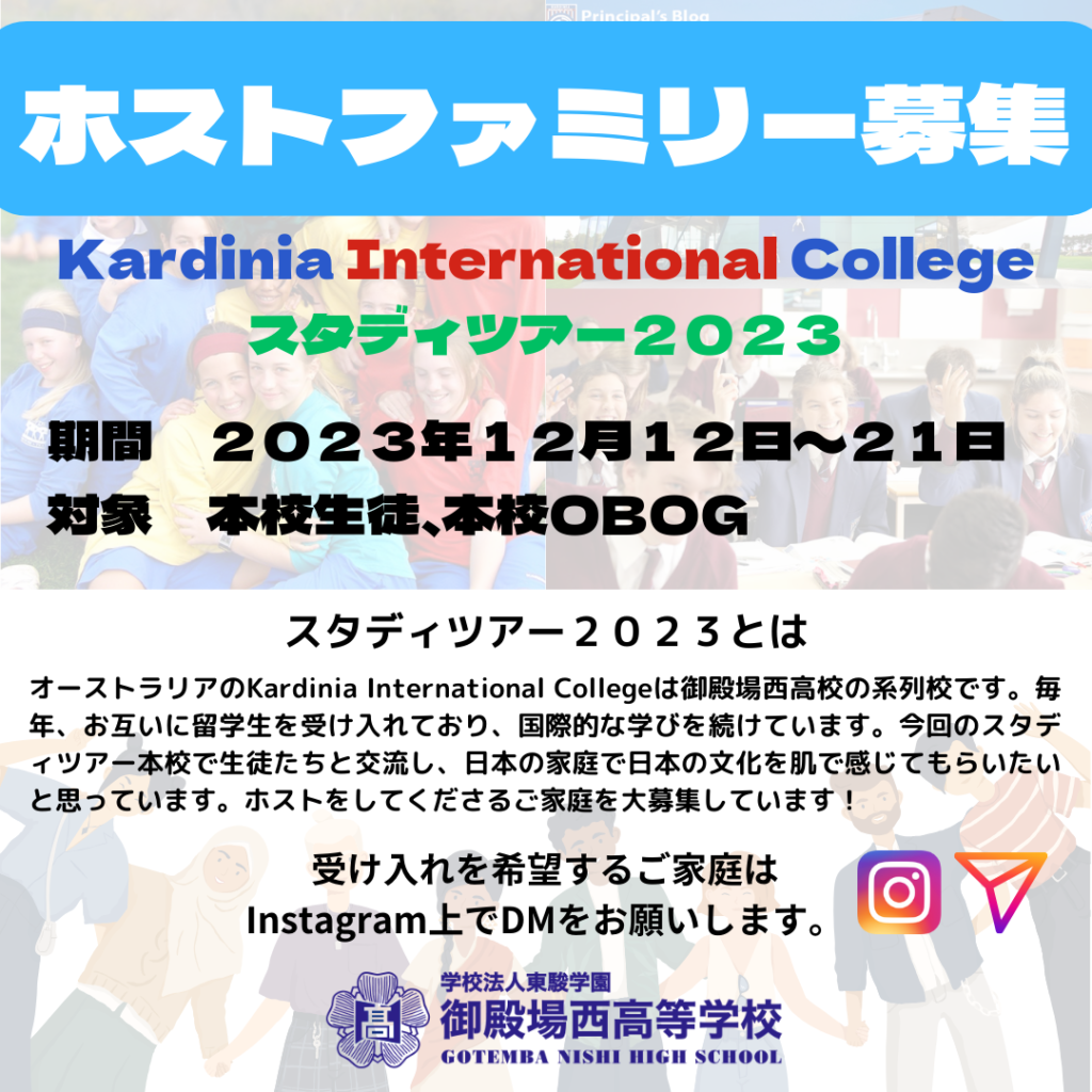 4年ぶりにカーディニア・インターナショナル・カレッジからスタディツアーを受け入れることとなりました。約20人の生徒と先生がオーストラリアから、この御殿場西高校で生徒たちとともに学び、国際交流をすることとなります。このスタディツアーで最も大切にしたい学びの場として、ホストファミリーの存在があります。かけがえのない出会いを生徒だけではなく、保護者の皆様にもしていただきたいと思います。また、言語や文化の違いの中に、共通した普遍のものを発見する機会にもなり、自分自身の視野の枠を広げていくことにもつながります。ぜひ多くのご家庭にご協力いただきたいと思います。ホストにご協力いただけるご家庭は、本校のグローバル教育担当までご連絡ください。