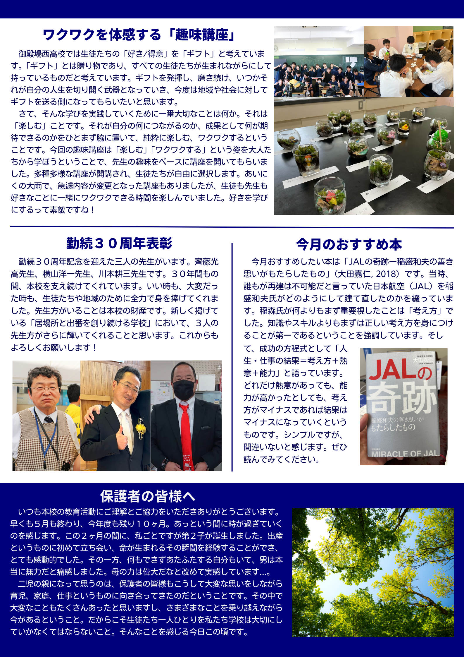 御西高だよりが発行されました。 選択型修学旅行、部活動報告、卒業を迎える3年生へのメッセージ等盛りだくさんとなっています。 ぜひご一読ください。