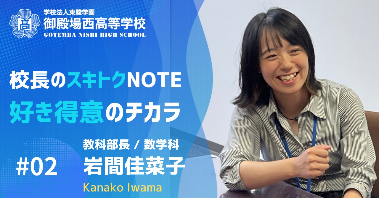 校長のスキトクNOTE 第2弾となる今回は岩間佳菜子先生が登場してくれました。 今年度から教科部長として本校の授業改革を引っ張ってくれている佳菜子先生。 その教育観…