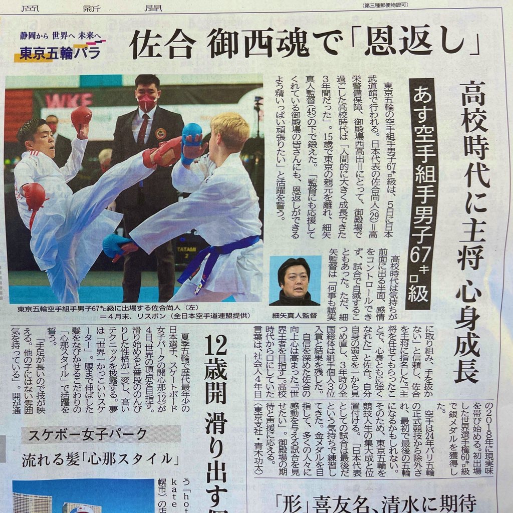 8月5日(木)日本武道館にて東京オリンピック空手組手67キロ級に御殿場西高等学校空手道部OBの佐合尚人君が出場します。 紆余曲折の果てに悲願の五輪出場を果たすことと…