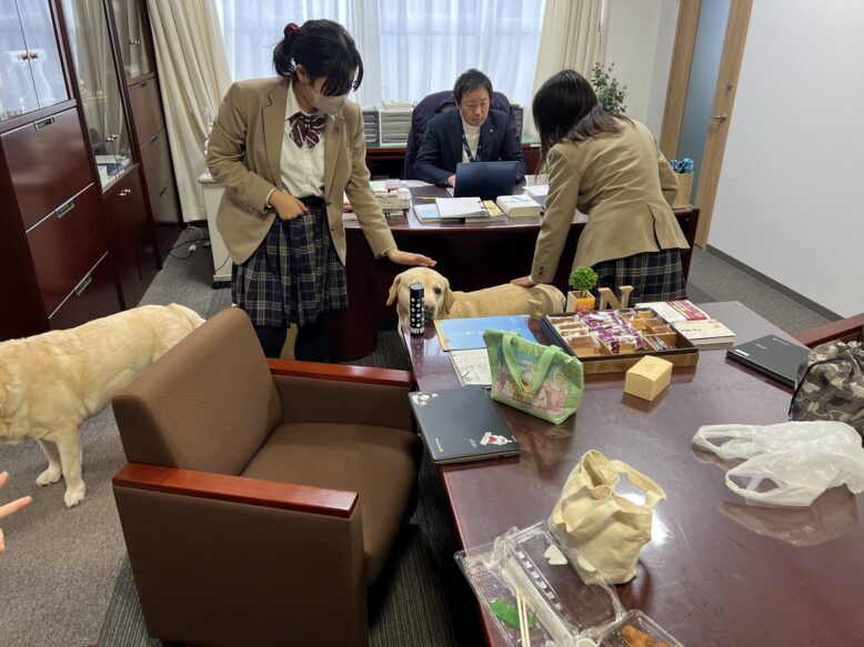 昼休みや放課後は、たくさんの生徒と触れ合う時間になっています。本館1階で、生徒たちと触れ合ったり、校内を一緒に歩いて回ったり、楽しい癒しの時間です。